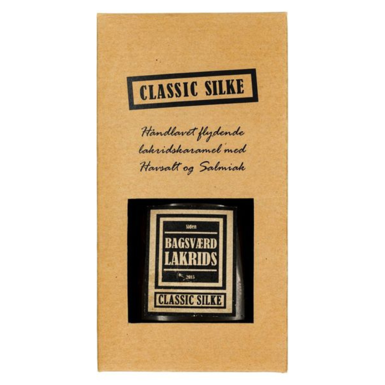 Bagsværd Lakrids Silke Classic er en silkeblød og smagsintens lakridskaramel i flydende form, udviklet med udgangspunkt i den populære Classic-lakridskaramel. Den dybe og fyldige lakridssmag gør den til en alsidig ingrediens i både søde og salte retter. Brug den som en luksuriøs topping på is og desserter, i bagværk for at tilføre en unik lakridsprofil, eller som en spændende smagsgiver i madlavning. En ægte delikatesse for lakridselskere.